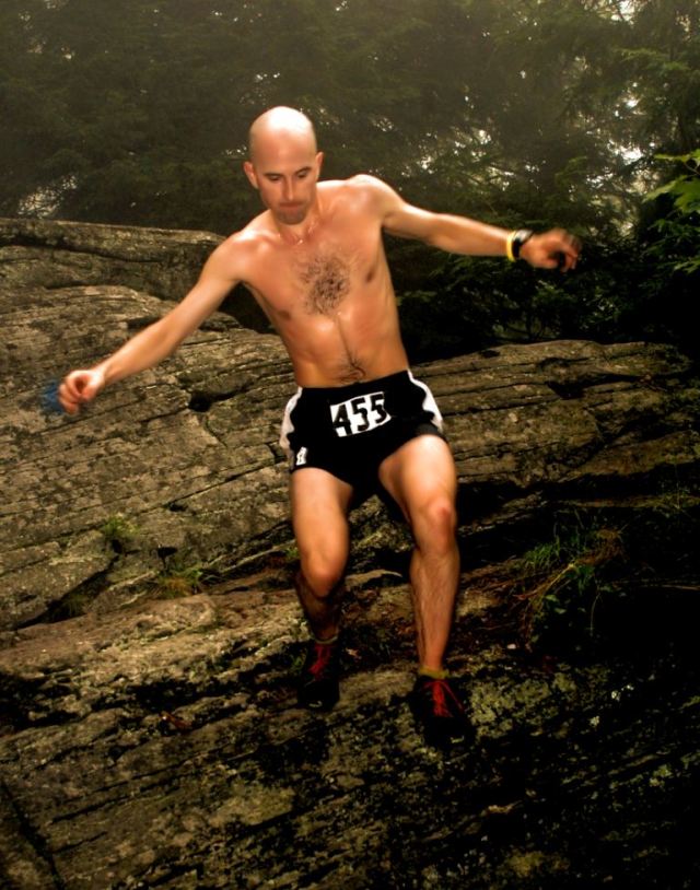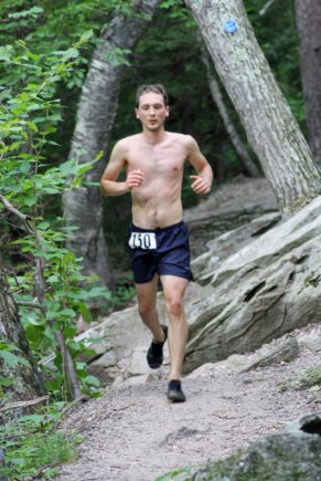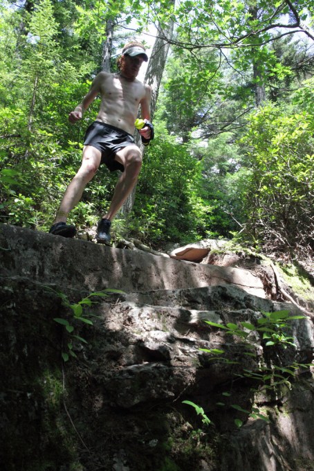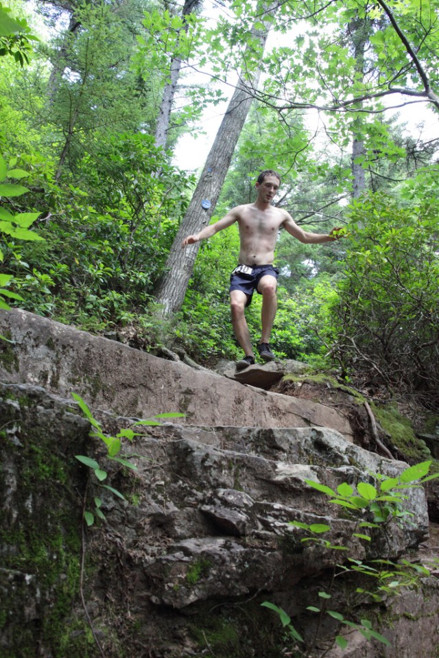На спуске я  догоняю Джерри и пытаюсь его обескуражить, устремляясь в отрыв. Этот трюк не удается и Джерри меня догоняет. Некоторое время мы бежим вместе, не проронив ни слова. Концентрация на пределе, так как бесконечные булыжники и корни норовят сбить нас с ног. Мы по нескольку раз спотыкаемся и падаем на камни, но к счастью обходится без серьезных повреждений и скорость не сбавляется. К середине дистанции наше отставание от двух лидеров — 7 минут. Для меня это значило, что нет никаких вариантов догнать их, и нужно сконцентрироваться на том чтобы отвоевать 3-е место. Мой план был держаться позади Джерри на всех оставшихся подъемах, не упускать его из вида, не оступаться, и на вершине последней горы ускориться в отрыв. Так я и сделал.