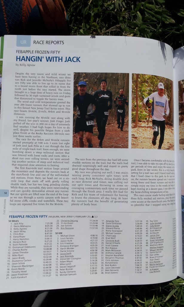 Проиграть Джеку Пилла было не зазорно. На его счету, как оказалось, победы в престижных ультра-марафонских забегах, в том числе «Вермонт100» (2009 год). Джек – известный спортсмен и тренер: ему сейчас за 50, и бегом он впервые начал заниматься только после 40 лет! Он живет и тренируется в штате Вермонт, окруженный лесистыми горами. Вот его подробный отчет об этой победе: http://jackpsblog.blogspot.com/2012/02/febapple-frozen-fifty-race-report.html?spref=fb