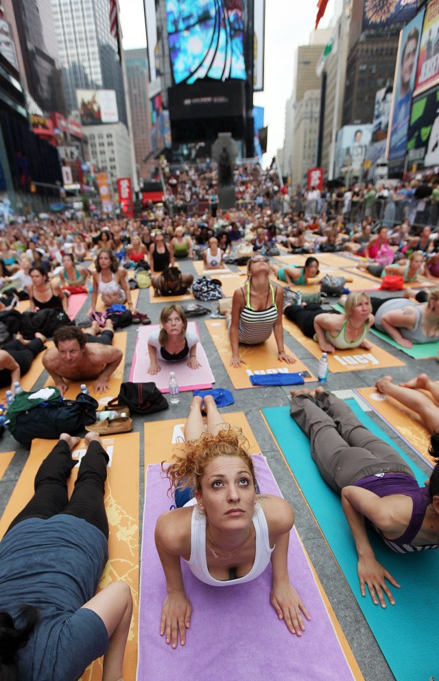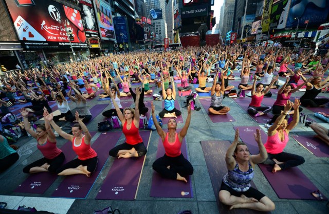 Уже в который раз в самый долгий световой день в году Таймс Сквер превращается в одну огромную йога-студию — в несколько кварталов длиной, около 20 тыс. человек. Занятия шли сегодня на протяжении всего дня.