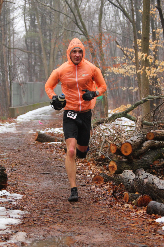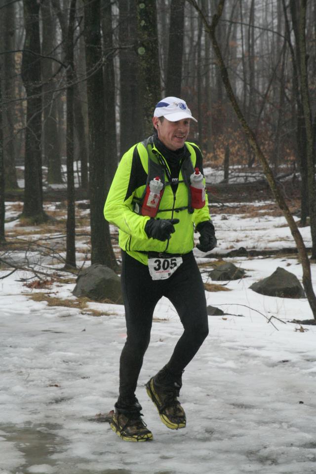 Понимая, что я скорее всего не пробегу всю дистанцию, я пошел ва-банк: быстрый старт, очень легкая форма одежды (в расчете на тепло от интенсивного темпа и чтобы облегчить подъемы на многочисленные холмы) — только шорты, перчатки, пластиковый дождевик, и минималистские кроссовки для грязи. Каменистые тропы покрыты коркой льда, и у многих бегунов были специальные металлические «когти» на кроссовках.